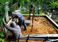 Вкопанные ранее сваи послужили великолепной основой для металлического каркаса, который мы и сварили прямо на территории места захоронения. Каркас был установлен по периметру участка с целью придать дополнительную жёсткость опалубке.